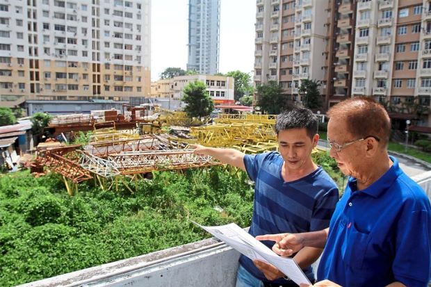 Such an eyesore: Kuan (left) pointing out the pestbreeding ground as Liew shows him a newspaper report on the problem at Azuria Condominium, Tanjung Bungah.